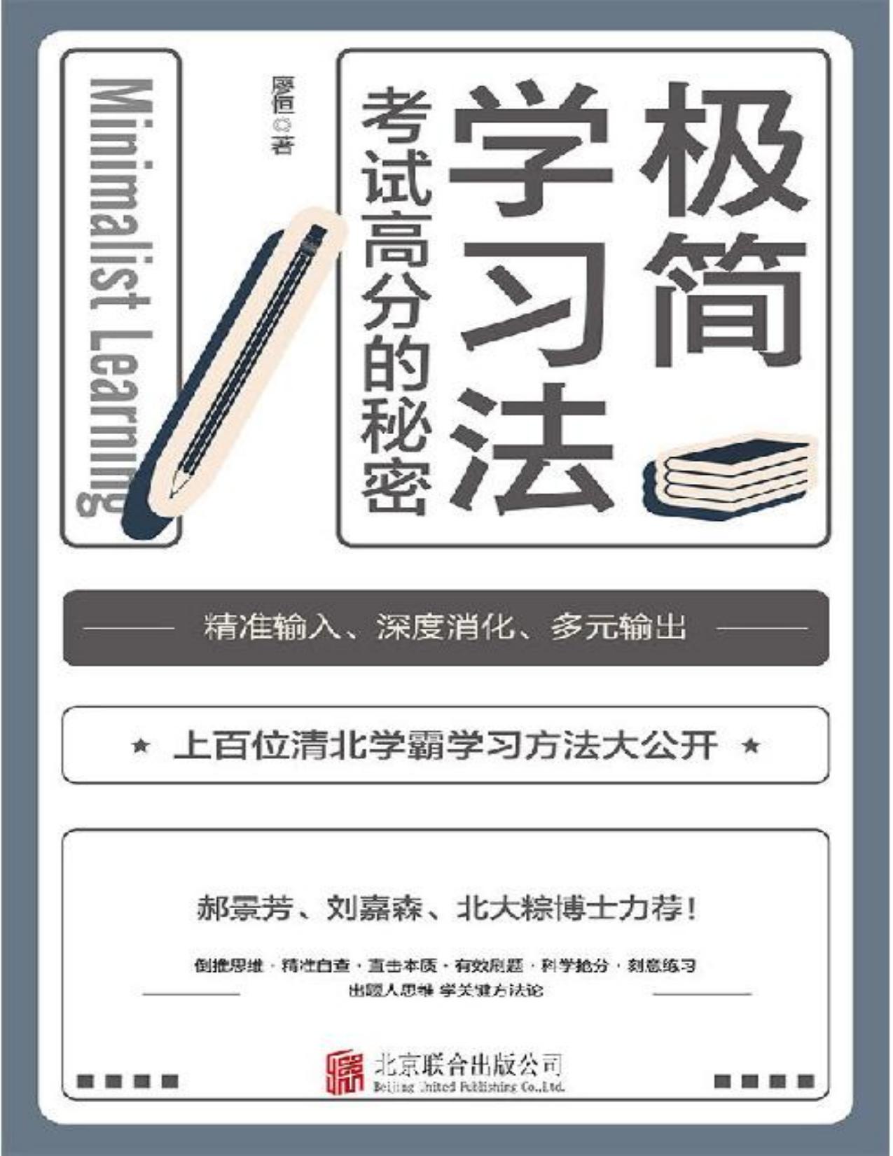 《极简学习法》 在深度采访了上百位清华北大学霸后,作者发现,除了极少数的天才以外,大多数考入清北的学生的智商和普通人没有太大差别,他们之所以能够考上清华北大,是因为他们找到了对的学习方法。在这本书中,作者抽丝剥茧,总结出一套适用于大多数人学习知识和技能的学习方法。在作者看来,任何学习都可以分为三个阶段:精准输入、深度消化、多元输出。首先是知识的输入,就是先把新的知识摄入进来;然后是知识的消化,将输入进来的知识搞懂;最后是把学到的这些知识用起来。希望这本书能让每个在学习中感到困惑或者不知道如何学习新技能的人从中受益。
